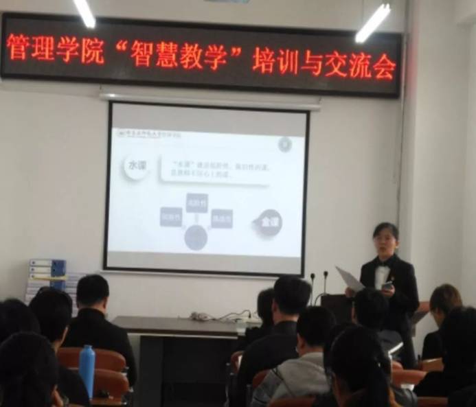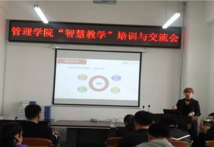 “十三五”发展规划》,鼓励教师利用信息技术更新课程资源,主动适应学生个性化发展和多样化学习需求,推动信息技术与教育教学深度融合,促进优质教育教学资源应用与共享,采用线上线下有机结合的教学模式引导学生进行自主合作探究式学习,提高学生学习成效,提高课程教学质量,管理学院于4月17日下午在社科楼220室开展了'智慧课堂'培训与交流会,参与此次会议的有学院党委书记刘可心和副院长万立军以及管理学院的全体教师。