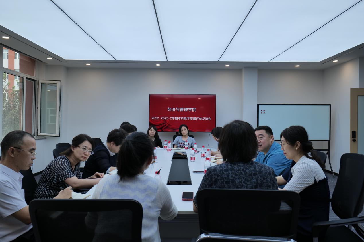 于6月28日下午15点30分在崇师楼A221开展2022-2023-2学期本科教学质量评价反馈会。本次会议由学院副院长祁凯主持,学院院长徐光、学校督导姚虹、学校督导郜春莲、学院督导和各系主任及系副主任出席会议。
