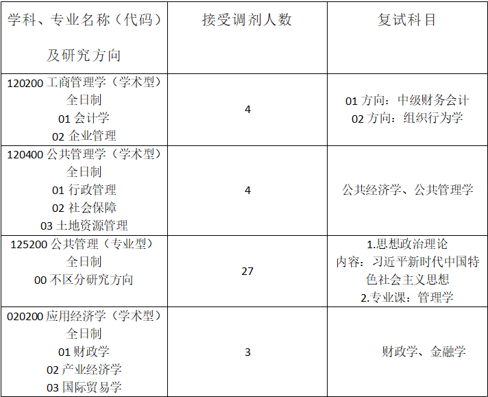 我院工商管理学(学术型)、公共管理学(学术型)、应用经济学(学术型)、公共管理(专业型),与我院招生专业相同或者相近、初试分数达到国家一区线的考生均可申请调剂。现将我学院招生学科的调剂信息发布如下(附后)。