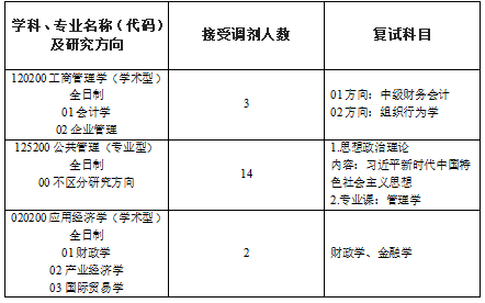 我院工商管理学(学术型)、应用经济学(学术型)、公共管理(专业型)三个专业接受调剂,与我院招生专业相同或者相近、初试分数达到国家一区线的考生均可申请调剂。现将我学院招生学科的调剂信息发布如下(附后)。