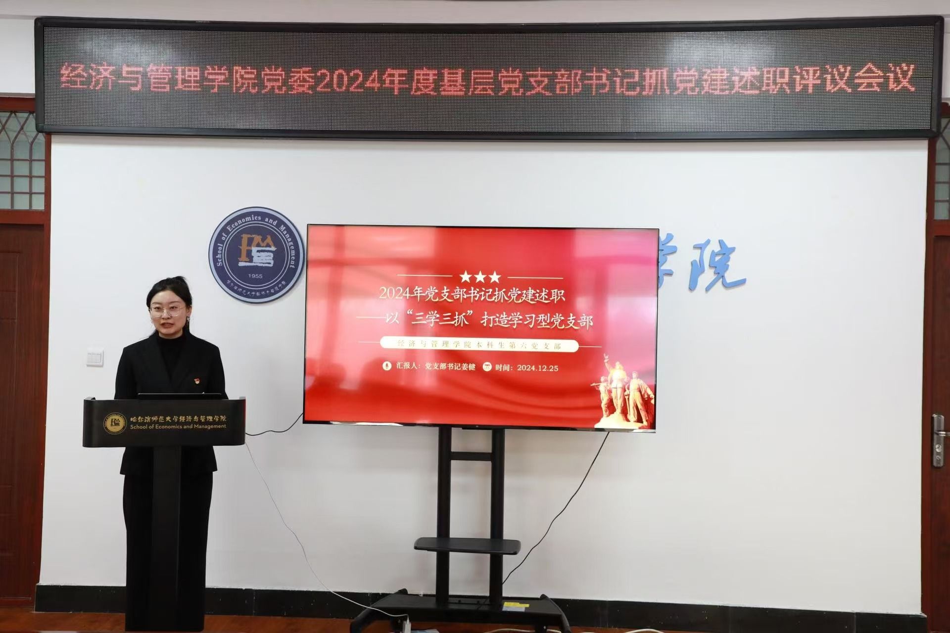 会议第一项,本科生第五党支部书记陈凤、公共管理系教师党支部书记宋丽丽、研究生第二党支部书记赵东威、本科生第六党支部书记姜健、物流管理系教师党支部书记许冰、本科生第七党支部书记金东旭围绕支部基本情况、履职情况、工作的不足及未来建设预期等方面进行了全面系统的述职,学院领导班子以“一述一评”的方式,对现场述职的党支部书记进行点评,在肯定成绩的同时也为支部党建指明了今后努力方向。