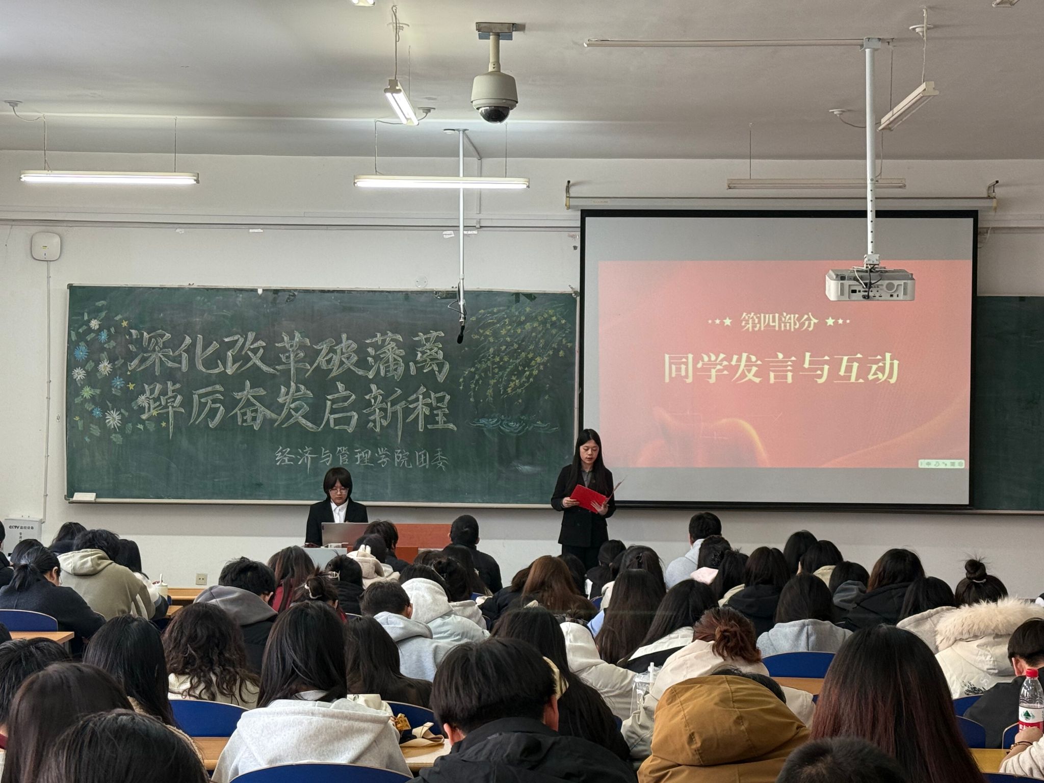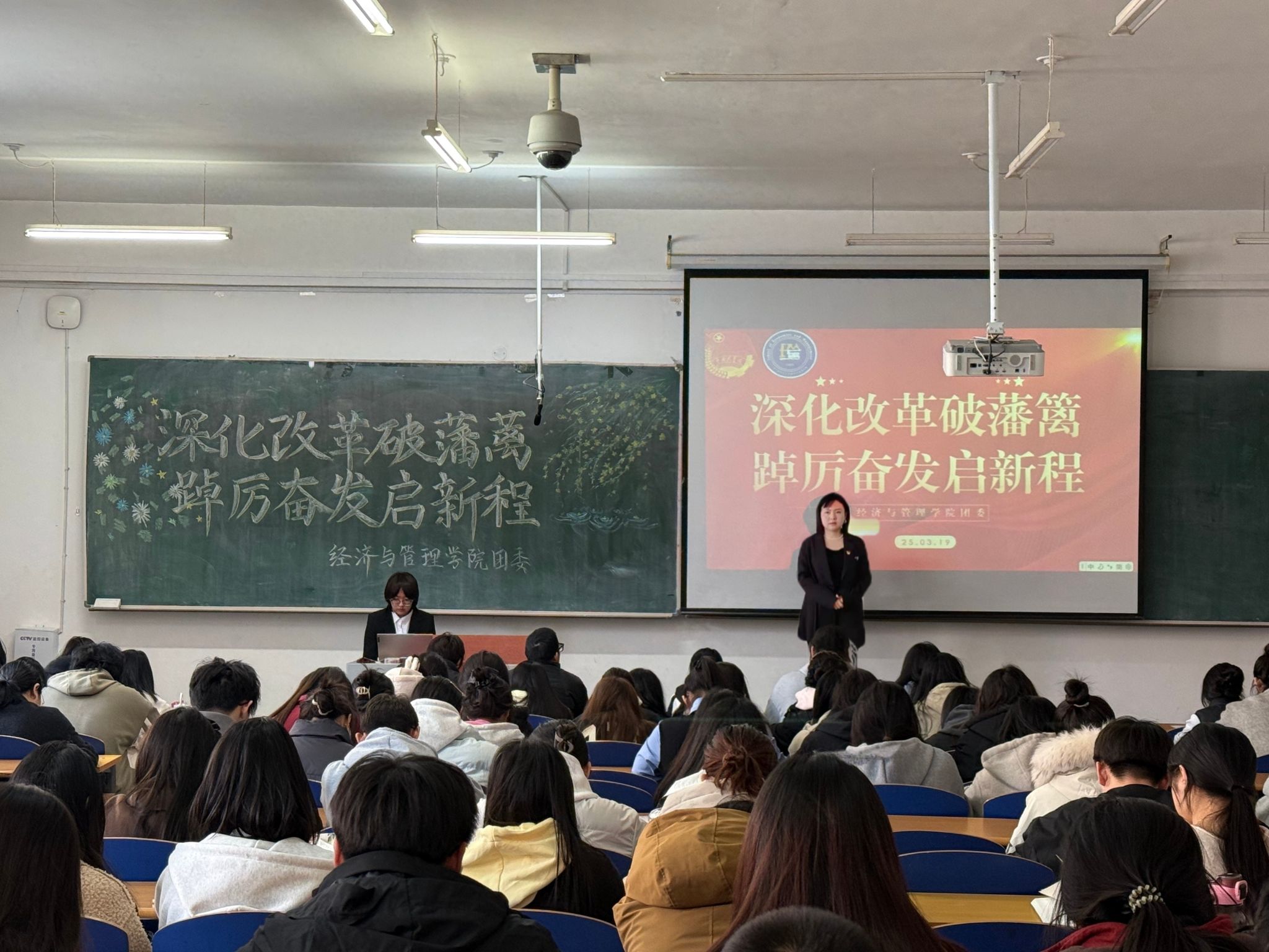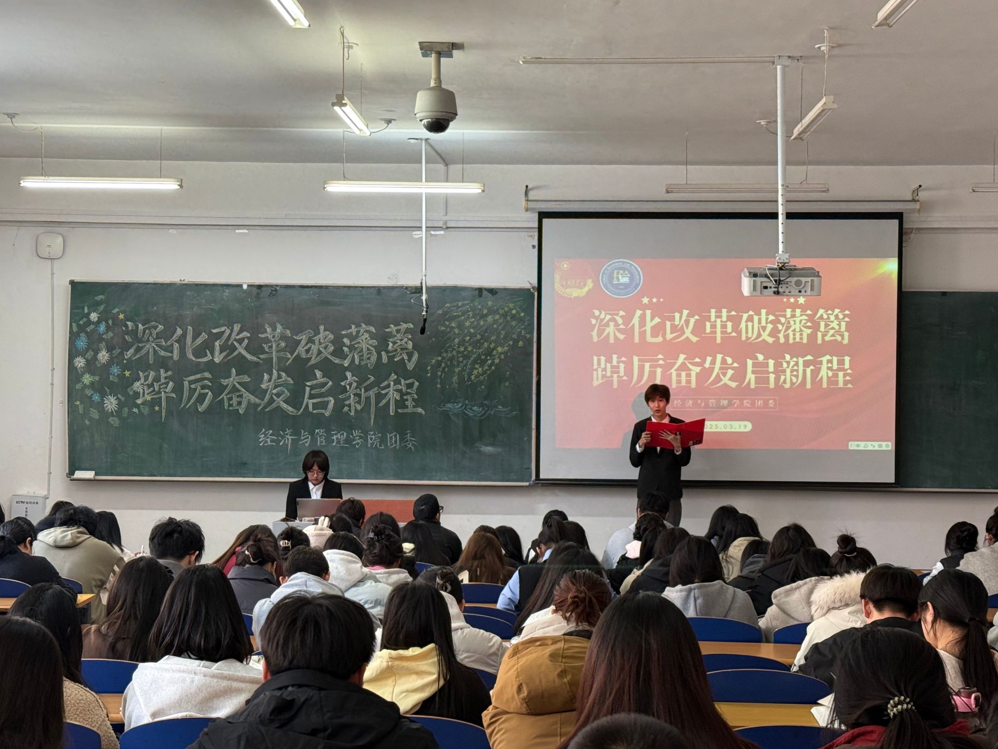 于2025年3月19日在崇师楼D203开展了“深化改革破藩篱,踔厉奋发启新程”主题理论学习活动,学院团委书记陈凤、各专业学生代表共138人参加活动,本次活动由团委学生干部李骏主持。