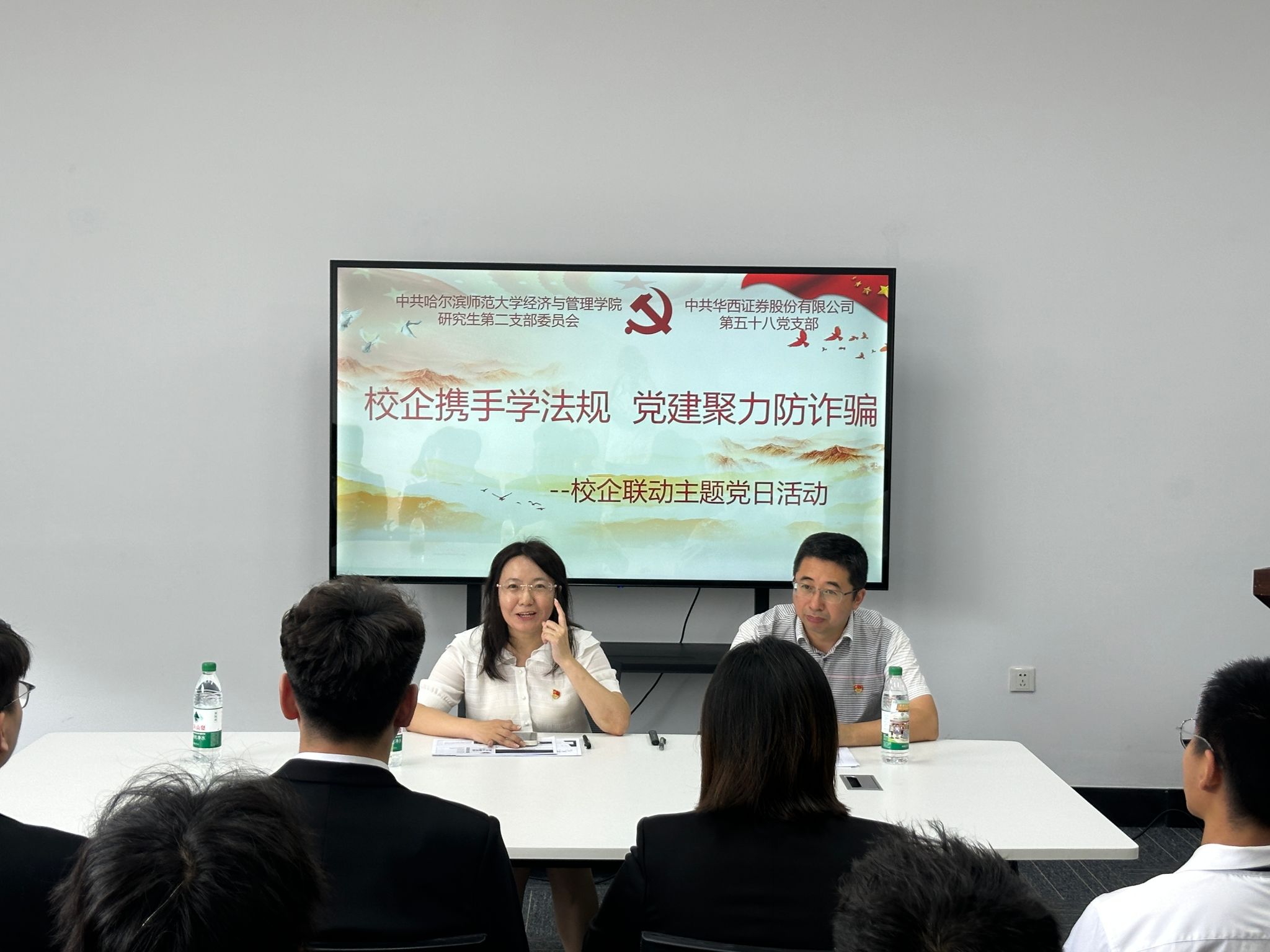研究生第二党支部与华西证券哈尔滨第五十八党支部于2025年6月30日在崇师楼B区316教室联合举办“校企联手学法规,党建聚力防诈骗”主题党日活动。华西证券哈尔滨第五十八党支部书记邱波担任主讲,188bet
