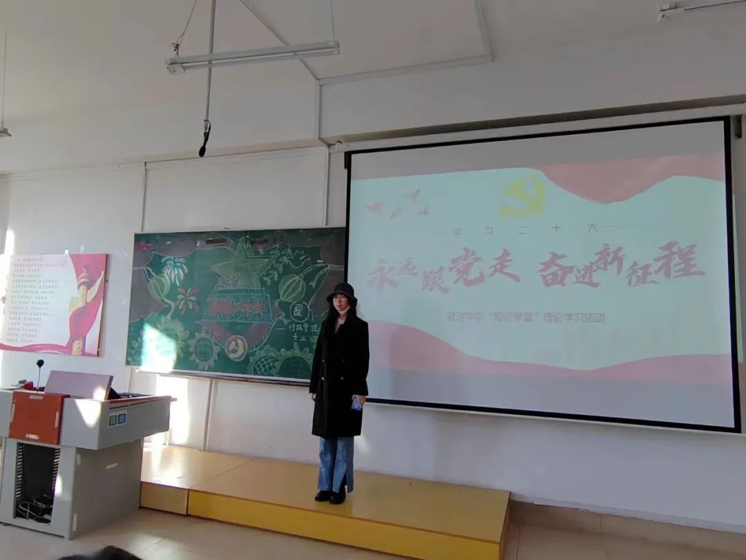 日月开新元,万象启新篇。2022年10月22日,中国共产党第二十次全国代表大会圆满完成各项议程和崇高使命,在北京胜利闭幕。为引导广大青年深刻领会党的二十大精神,提升青年学子学习党的二十大的积极性和自觉性,赓续红色血脉,厚植家国情怀,管理学院于10月24日在早自习期间,在各专业教室举办了“学习二十大,永远跟党走,奋进新征程”主题知识早餐理论学习活动,管理学院全体学生参与了此次活动。