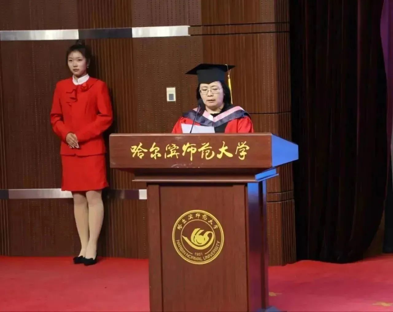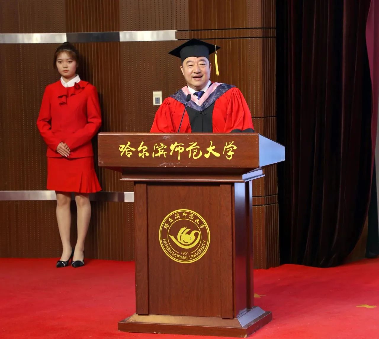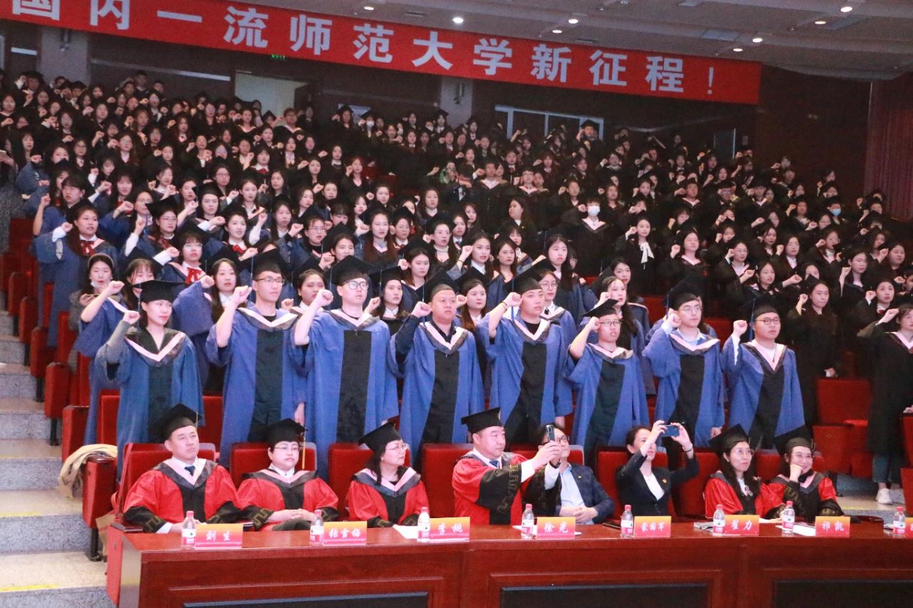 优秀硕士生代表王雪冰同学这样说。首先,她代表全体2023届毕业研究生向母校、授予知识的老师以及默默陪伴的亲友表达了最衷心的感谢和崇高的敬意。接着,她在发言中回首了在师大追逐梦想的时光,怀揣着对大学的憧憬走进校园,“天鹅学长”、“宝宝巴士”、“缕缕菜香”成了镌刻进记忆深处的美好回忆……最后,她用习近平总书记的一句话“青春由磨砺而出彩,人生因奋斗而升华”来激励所有毕业生们,作为新时代的青年学子,有责任肩负起新时代的重任,不负时代,不负韶华,成为新时代奋勇前进的搏击者,带着母校的期望、老师们的教诲、朋友们的鼓励,砥砺前行,以青春之名,赴时代之约。