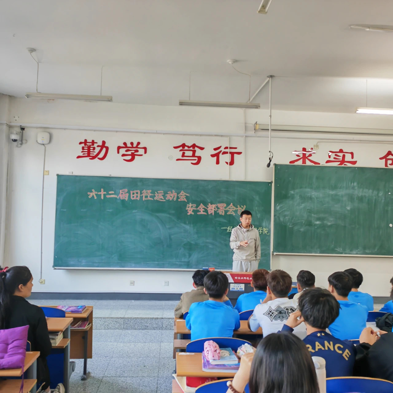 2023年5月22日,学院运动员队伍教练贾涛老师对全体运动员召开赛前安全教育大会。会上,贾涛对全体参赛运动员们表示感谢,强调校运动会是弘扬体育精神,活跃校园文化,增强身体素质,培养德智体美劳全面发展优秀大学生的重要载体。同时,贾老师对运动员们提出以下几点要求:一要遵守赛场纪律,服从赛事管理,本着“友谊第一、重在参与、确保安全、赛出成绩”的原则,在赛场上充分展现经管学子的青春魅力。二要注意自身安全,提前进行运动训练,储备好自己的体能,比赛过程中量力而为,出现身体不适等情况要及时联系医务工作人员。本着在比赛过程中把参赛运动员安全放在第一位的理念,学校已为所有参赛运动员购买了人身意外伤害保险。会后,运动员们纷纷表示,将以饱满的热情、高昂的斗志和良好的状态投入训练,为比赛做好充分准备。此次会议不仅极大的鼓舞了运动员们的士气,而且增强了全体运动员的竞争意识和集体荣誉感。