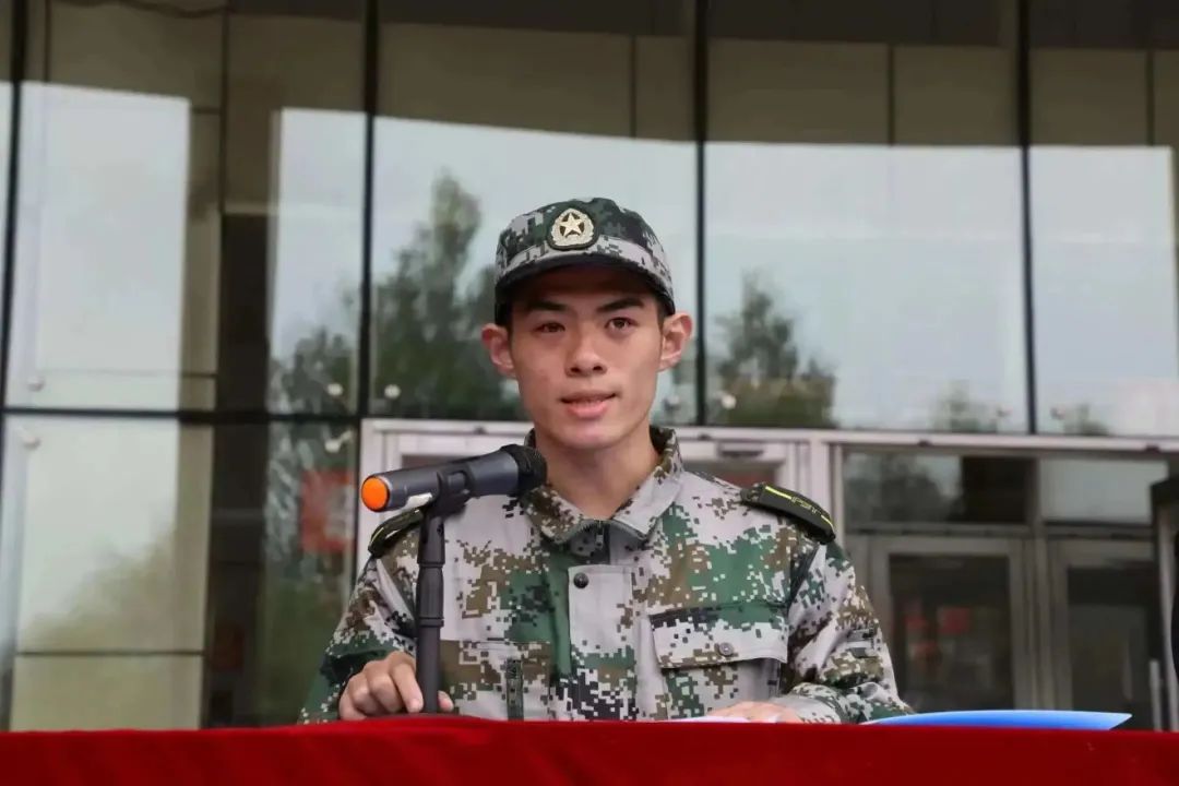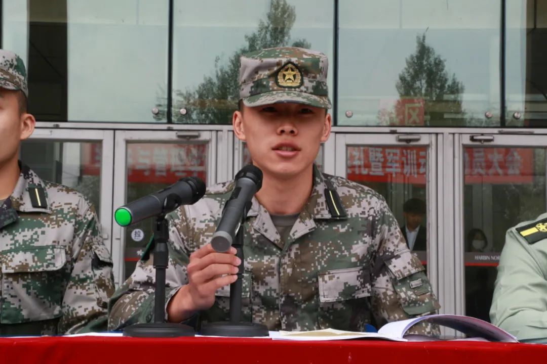 大会第七项,七连教官王智睿同志代表全体教官发言。王智睿同志在讲话中强调了军训的重要性,并从思想上、行动上、机制上对全体承训教官提出三大要求,对全体参训人员提出三点期望:敢于吃苦,敢于挑战;服从命令,听党指挥;安全参训,保护自己。