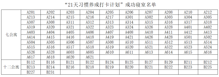 2023级本科生共166个寝室(合计691人)参加本次活动,活动采取每日打卡以及抽检的形式,对参加活动的寝室进行监督与督促,最终成功坚持的寝室共有116个(合计503人)。之后将为成功坚持的同学发放学分,具体成功寝室如下图。