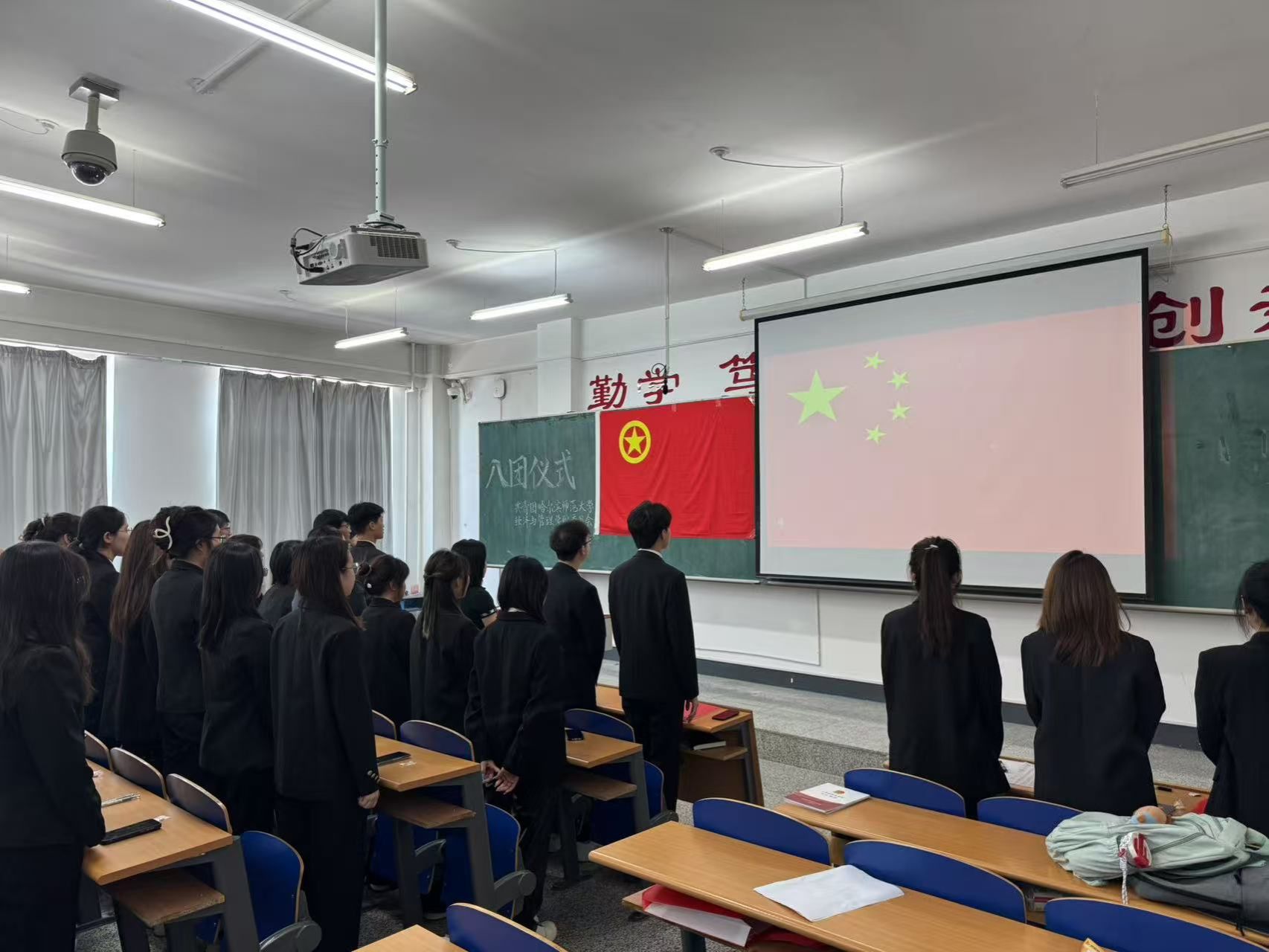 仪式第一项,全体起立,奏唱中华人民共和国国歌,入团仪式在庄严肃穆的国歌声中正式拉开帷幕。