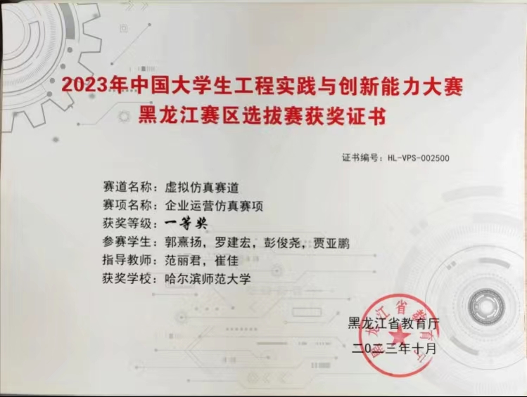 参加黑龙江赛区的选拔赛。10月15日,2023年全国大学生工程实践与创新能力大赛暨第五届黑龙江省大学生企业运营虚拟仿真大赛如期在哈尔滨商业大学落下帷幕。