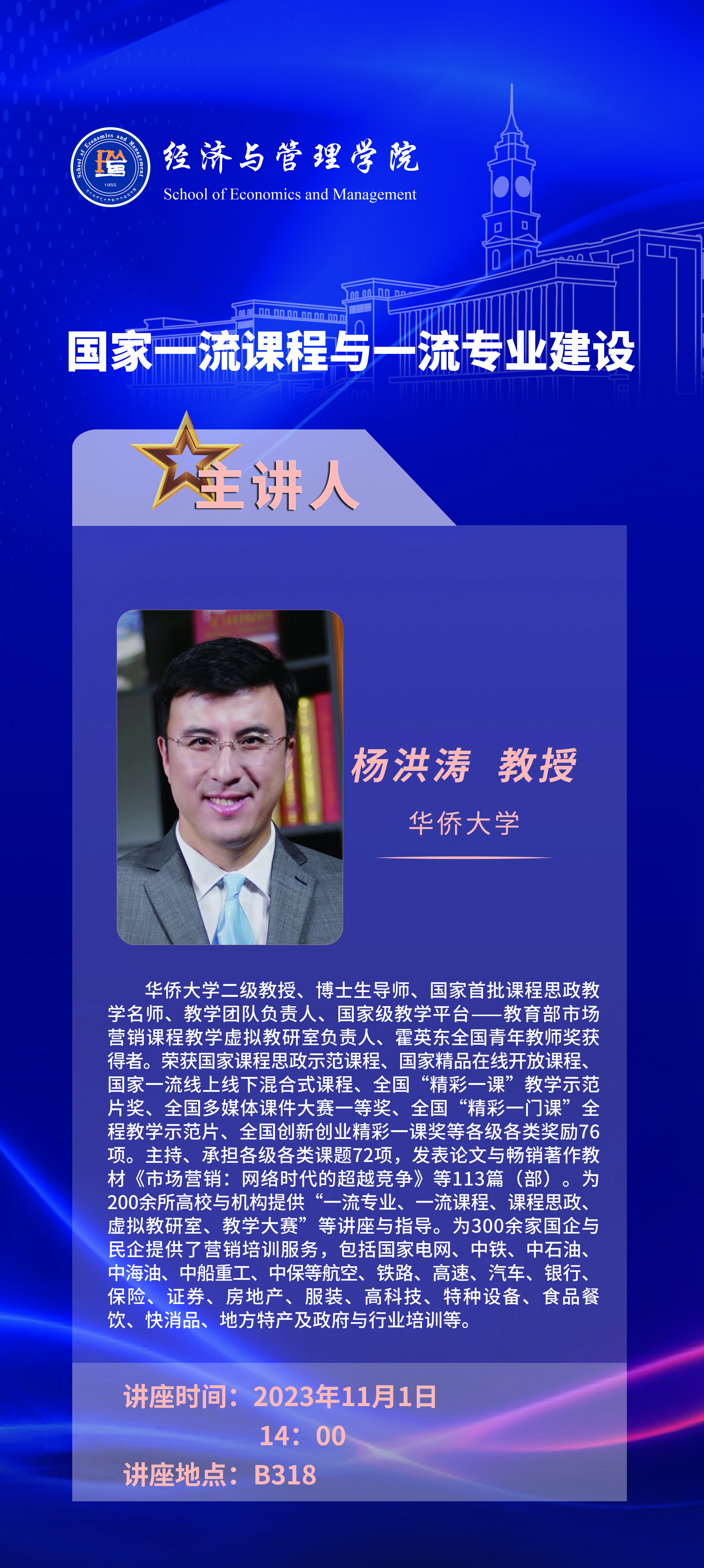 华侨大学二级教授、博士生导师、国家首批课程思政教学名师、教学团队负责人、国家级教学平台----教育部市场营销课程教学虛拟教研室负责人、霍英东全国青年教师奖获得者。荣获国家课程思政示范课程、国家精品在线开放课程、国家一流线上线下混合式课程、全国 “精彩一课”教学示范片奖、全国多媒体课件大赛一等奖、全国“精彩一门课”全程教学示范片、全国创新创业精彩一课奖等各级各类奖励76项。主持、承担各级各类课题72项,发表论文与畅销著作教材《市场营销:网络时代的超越竞争》 等113篇(部)。为200余所高校与机构提供“一流专业、一流课程、课程思政、虛拟教研室、教学大赛” 等讲座与指导。为300余家国企与民企提供了营销培训服务,包括国家电网、中铁、中石油、中海油、中船重工、中保等航空、铁路、高速、汽车、银行、保险、证券、房地产、服装、高科技、特种设备、食品餐饮、快消品、地方特产及政府与行业培训等。
