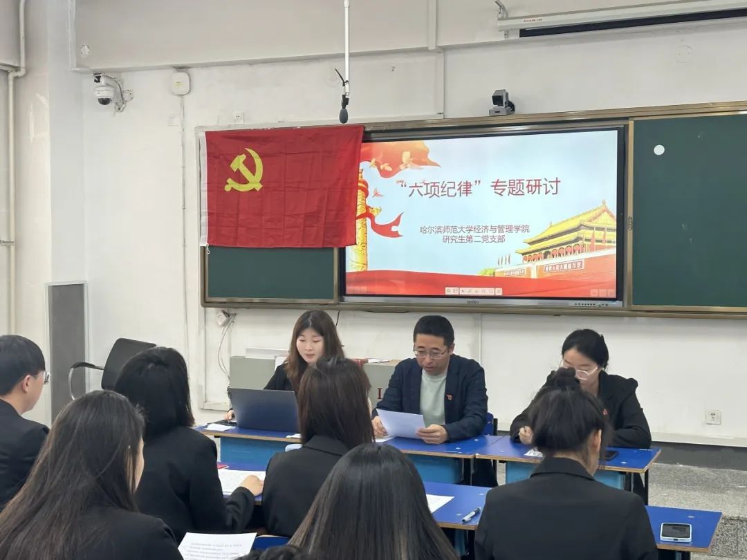 随后,研究生党员进行了集中交流研讨。研究生党员高铭徽在发言中讲到,作为一名党员,恪守纪律是我们入党时就明确遵守的准则。通过深入学习党的六项纪律,可以加强我们对党性修养的理解和自觉。在学习和生活中,要时刻牢记党的六项纪律和规矩,时刻保持道德操守,树立起正确的价值观和行为准则。支部其他党员也纷纷表态,王玉珏讲到,作为青年党员必须牢记党的宗旨和原则,严格要求自己,在政治上、思想上和行动上绝对服从党的决定。董丽结合自身学习情况讲到:“我将以这次学习为契机,将党的理论知识和我目前的学术研究领域相结合,在理论研究中提升自己的党性修养,在学术研究中践行党员守纪准则。同时注重自我约束和自我提升,积极在同学中传递正能量,团结身边的同学共同遵守纪律规矩。”